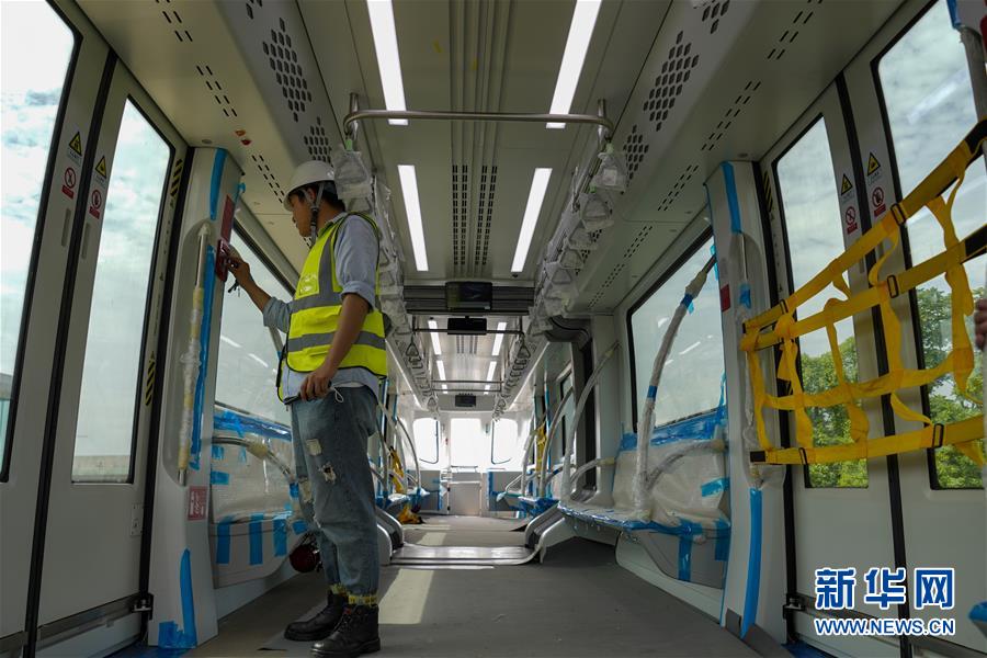 6月3日,工程技术人员在“云巴”车厢内对安装的电气设备进行调试。近日,重庆市首条“云巴”示范线项目在重庆璧山区正式亮相。此次发布的“云巴”采用电能驱动,具有转弯半径小、爬坡能力强、噪音低、安全性高、建设成本低、建造周期短等优势,能为乘客提供更智能、舒适、便捷的出行体验。据介绍,璧山区“云巴”示范线项目自2019年8月开建,线路正线全长15.4km,共设车站15座,预计2020年9月全线通车。新华社记者刘潺摄。