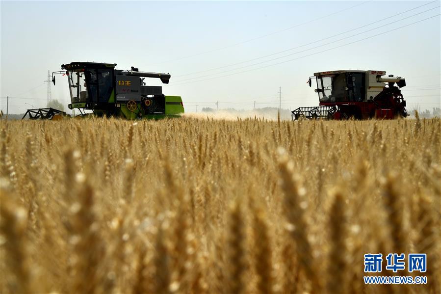 6月3日,收割机在汶上县郭仓镇的麦田里收获小麦。目前,我国第二大小麦主产区山东6000多万亩小麦进入收获阶段。农民们抢抓有利天气,自南向北陆续开镰。新华社记者郭绪雷摄。