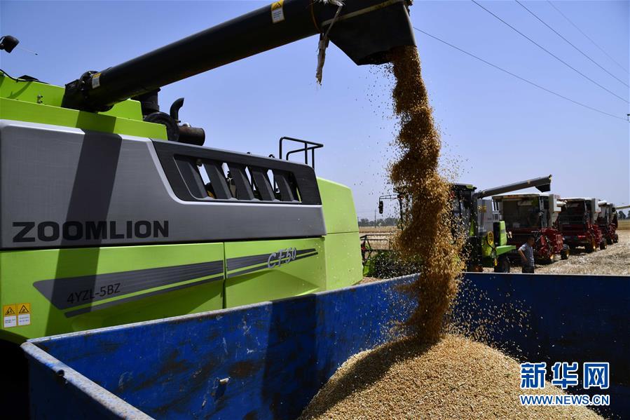 6月3日,在汶上县郭仓镇,收割机在收获小麦。目前,我国第二大小麦主产区山东6000多万亩小麦进入收获阶段。农民们抢抓有利天气,自南向北陆续开镰。新华社记者郭绪雷摄。