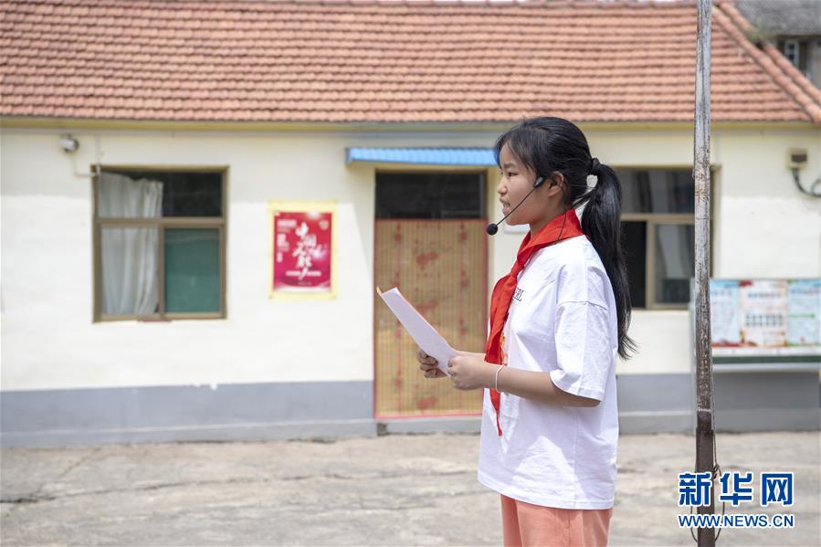 6月2日,秦春兰在学校的升旗仪式上发言。新华社记者杨晨光摄。