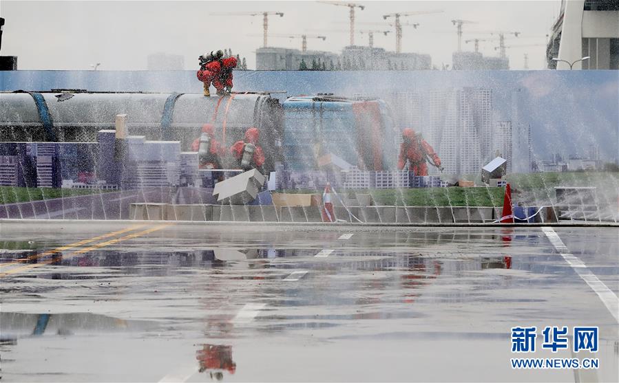 6月3日,救援人员在演练中使用水幕阻挡危化品扩散。新华社记者方喆摄。