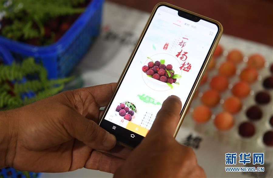 6月3日,在上虞区驿亭镇,舜利水晶杨梅专业合作社果农在查看自己的电商平台杨梅销售页面。近日,浙江绍兴上虞区二都杨梅开采。杨梅是上虞区传统特色农产品,目前上虞区二都杨梅种植面积1651公顷,年产量1.1万吨,2019年二都杨梅成功申报国家农产品地理标志认证。新华社记者翁忻旸摄。