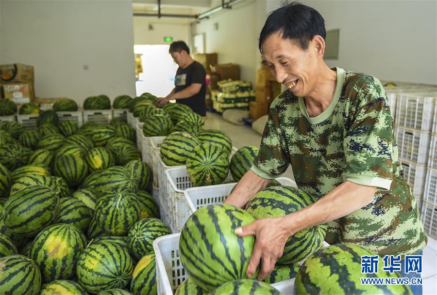 6月3日,村民在深州市鲜天下电商公司扶贫专区搬运西瓜。今年以来,河北省深州市围绕决胜全面小康、决战脱贫攻坚任务目标,在推进产业扶贫的过程中注重激发内生动力,通过电商扶贫、扶贫车间、特色种植养殖等多种形式,提升自我“造血”功能,提高贫困群众受益度。新华社记者李晓果摄。