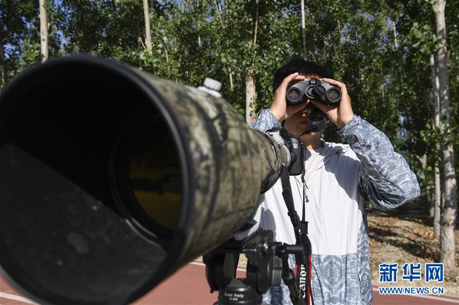 6月3日,李学明利用望远镜观察黄河湿地的鸟类活动。新华社记者冯开华摄。