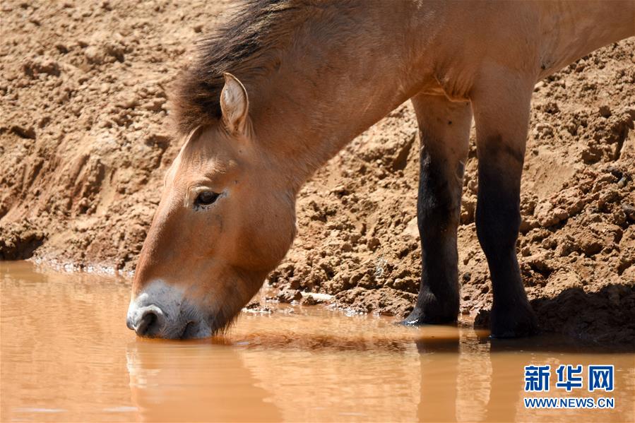 在新疆卡拉麦里山有蹄类野生动物自然保护区,一匹普氏野马在水源地饮水(6月3日摄)。新华社记者丁磊摄。