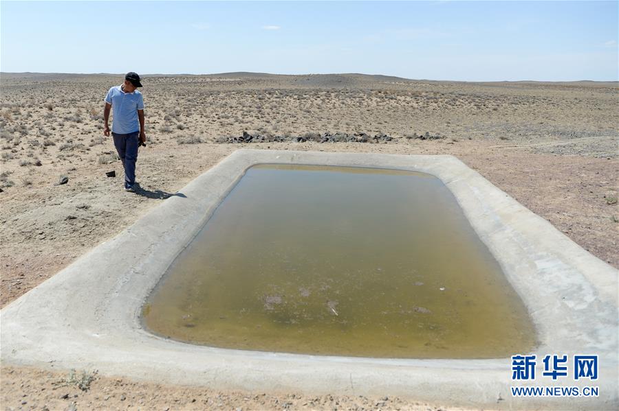 在新疆卡拉麦里山有蹄类野生动物自然保护区,管护员阿达比亚特来到人工建设的水池查看蓄水情况(6月3日摄)。新华社记者丁磊摄。