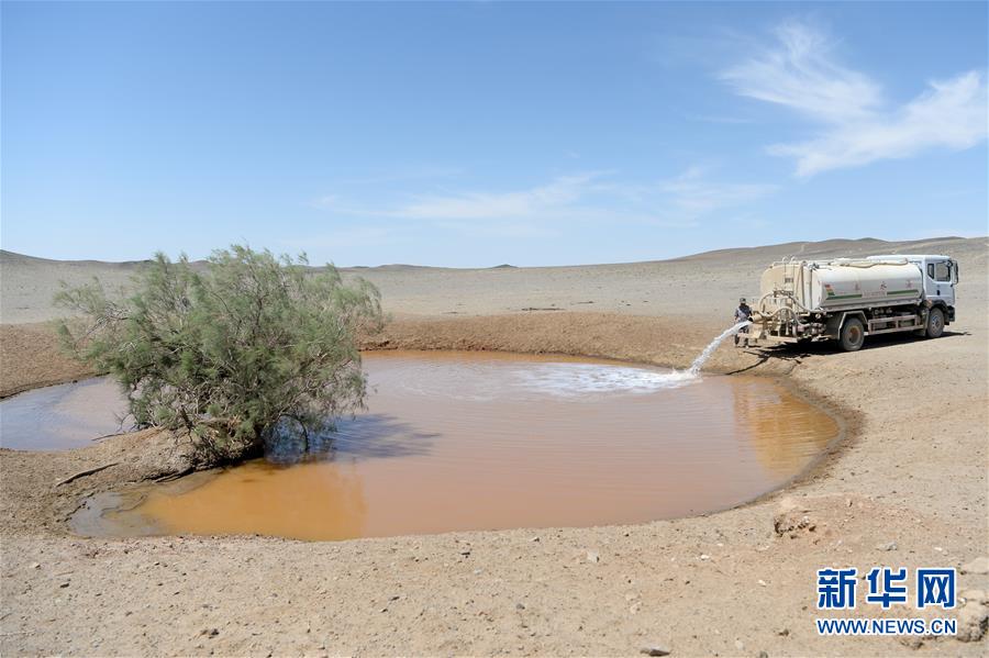 在新疆卡拉麦里山有蹄类野生动物自然保护区,管护员为水源地灌水(6月3日摄)。新华社记者丁磊摄。