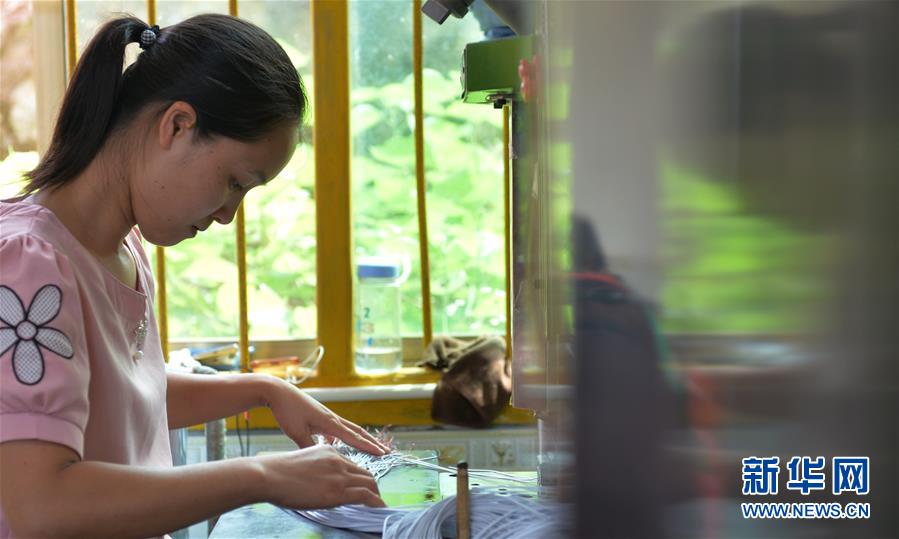 6月4日,一名女工在永州市新田县一处易地搬迁集中安置点的扶贫车间里加工电器零部件。新华社记者赵众志摄。