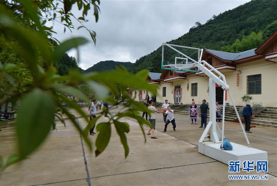 6月3日,人们在永州市新田县两江口村易地搬迁集中安置点内打篮球。新华社记者赵众志摄。
