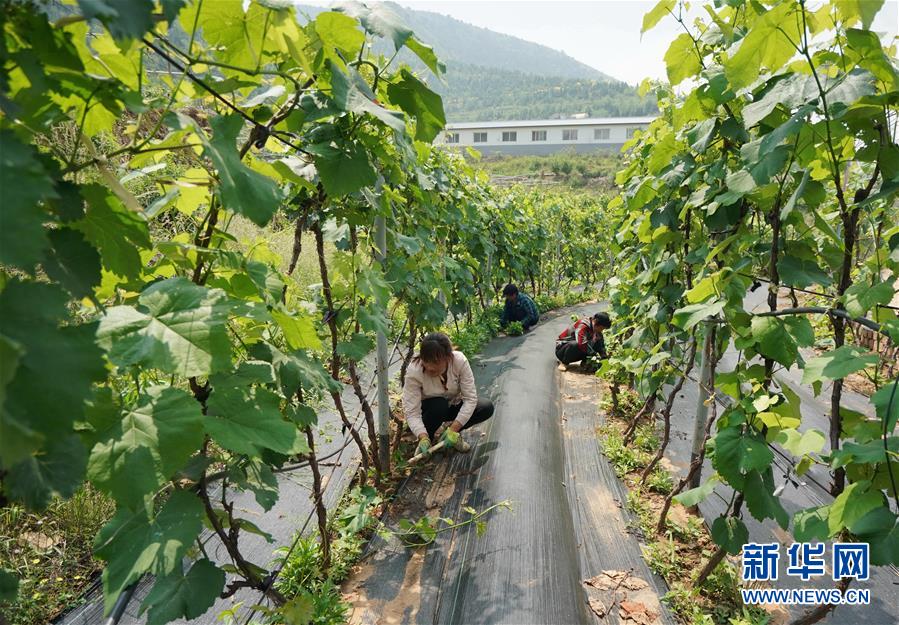 6月4日,唐山市丰润区火石营镇赵庄子村百草坡农产品农民专业合作社社员在生态农业园给葡萄藤除草。新华社记者郭雅茹摄。