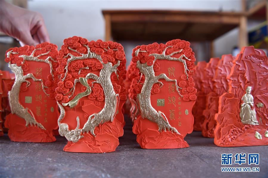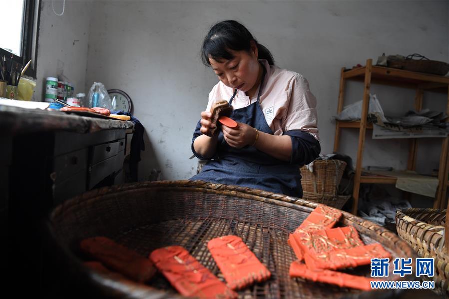 5月20日,安徽省非物质文化遗产徽墨代表性传承人项德胜在雕刻墨模。新华社记者刘军喜摄。