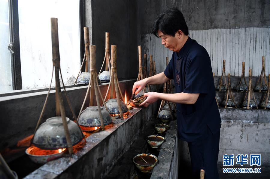 5月21日,安徽省非物质文化遗产徽墨代表性传承人项德胜在进行古法炼烟。传统徽墨制作工艺中,第一道工序就是炼烟。这一过程收集来的油烟是徽墨制作中最为重要的原材料。新华社记者张端摄。