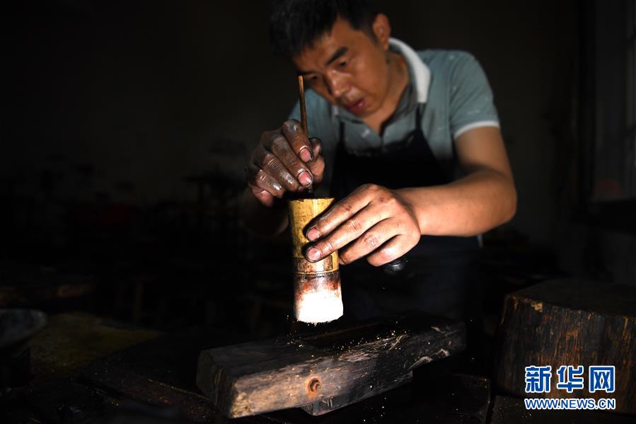 5月21日,安徽歙县“项氏徽墨”的工人在捶打墨胚。新华社记者张端摄。