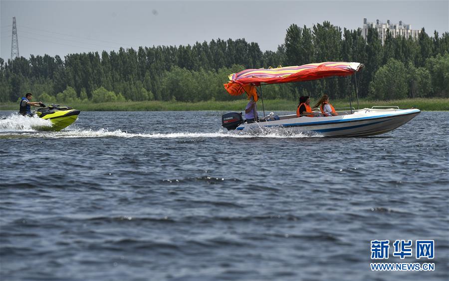 6月5日,游客在文安县赵王新河湿地公园游览。近年来,河北省文安县将植树造林与城市建设有机融合,探索“政府引导、企业运作、多方共赢”的市场化植树造林新模式,大规模推进国土绿化,打造人与自然和谐共生的优美生态环境,构筑京津雄绿色屏障。截至目前,该县森林覆盖率已经达到33%,城区绿地面积达到36.48%。新华社记者李晓果摄。