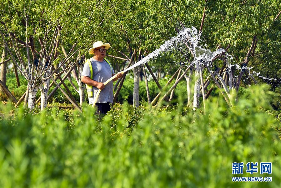 6月5日,在文安县迎宾大道,工人给花池浇水。近年来,河北省文安县将植树造林与城市建设有机融合,探索“政府引导、企业运作、多方共赢”的市场化植树造林新模式,大规模推进国土绿化,打造人与自然和谐共生的优美生态环境,构筑京津雄绿色屏障。截至目前,该县森林覆盖率已经达到33%,城区绿地面积达到36.48%。新华社记者李晓果摄。