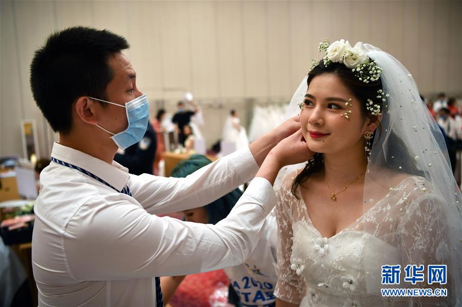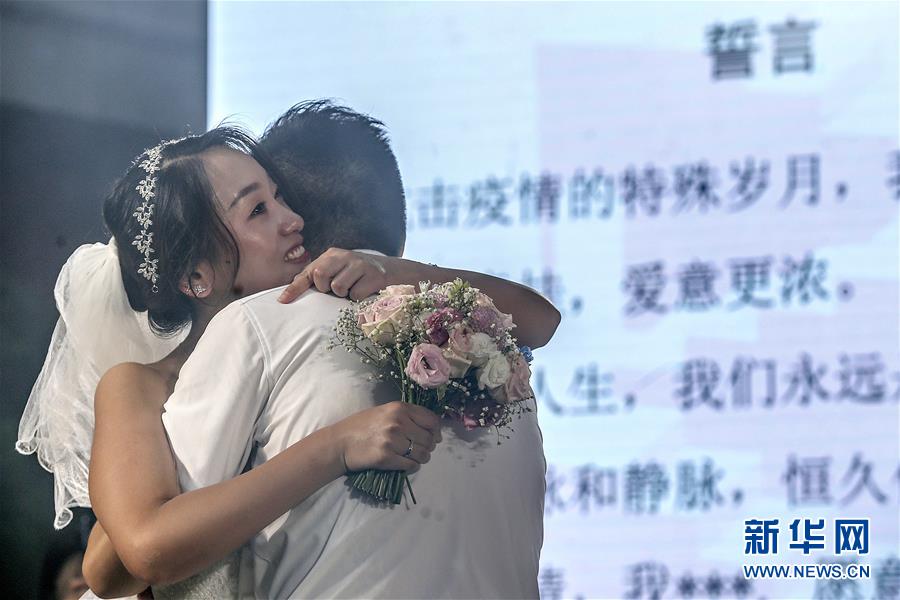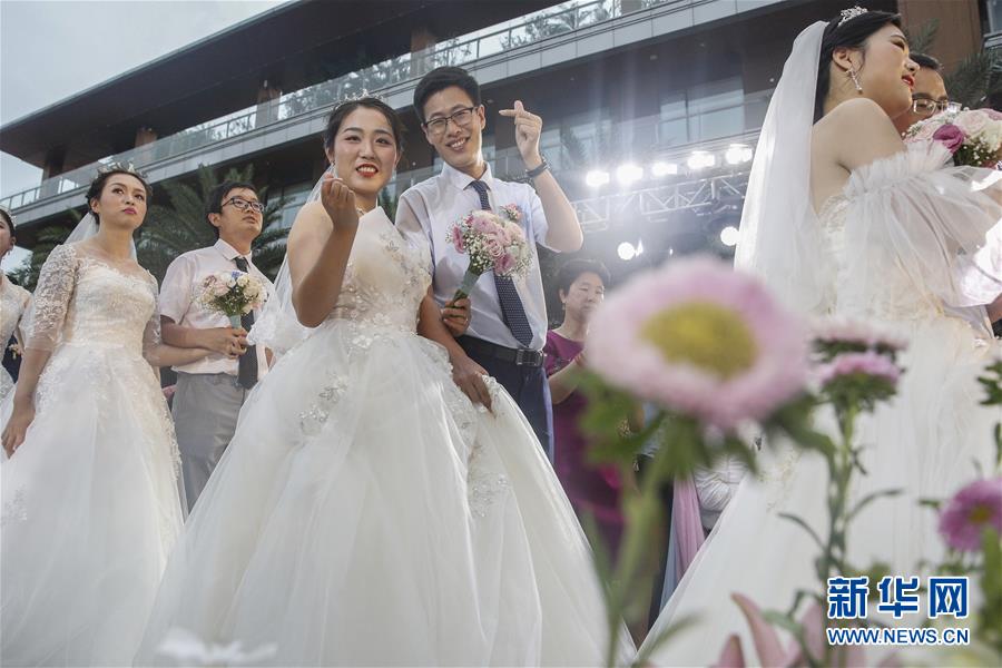 6月6日,新人在海南博鳌乐城国际医疗旅游先行区参加集体婚礼。当日,来自北京、武汉、广州等地的30对新人在海南博鳌乐城国际医疗旅游先行区参加了一场集体婚礼。参加婚礼的部分新人此前因参加湖北的抗疫工作而推迟了婚期。  新华社记者 张丽芸 摄