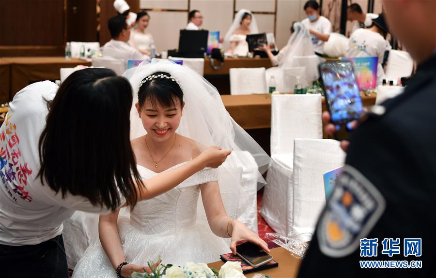 6月6日,海南省万宁市公安局疫情防控指挥部民警腾凯彪在为正在化妆的妻子侯俊霞拍照。 当日,来自全国15个省份的百对新人在三亚市亚特兰蒂斯度假区举行了一场特殊的集体婚礼,每对新人中至少有一位参与过抗击新冠肺炎疫情的工作。 新华社记者 郭程 摄