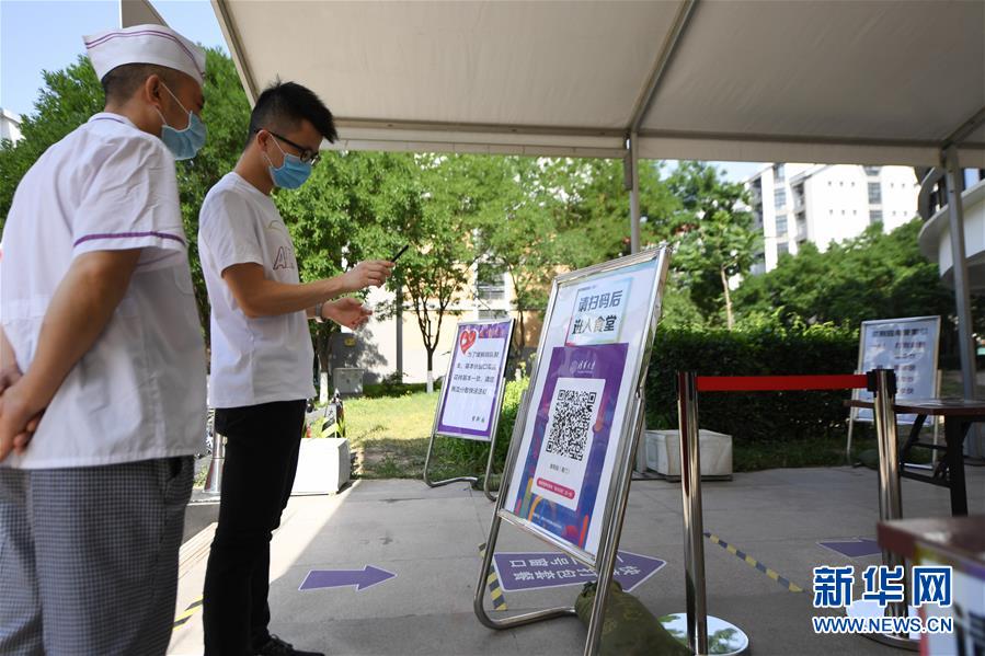 6月6日,在清华大学一个学生食堂门前,一名返校学生按要求扫码验证信息。 新华社记者 鞠焕宗 摄