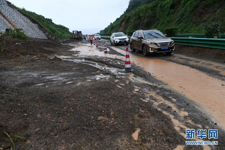 6月7日,在广西鹿寨至阳朔的高速公路上,车辆从一处发生滑坡的路段经过。新华社记者陆波岸摄