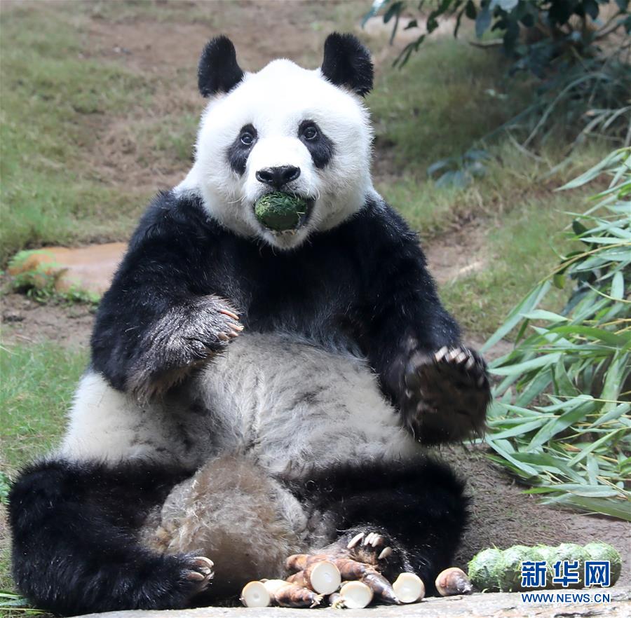 在香港海洋公园,大熊猫“安安”坐在小山坡上吃竹叶团(5月11日摄)。新华社记者吴晓初摄