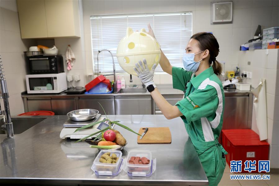 香港海洋公园陆生动物部监督殷漫萍在熊猫厨房介绍对熊猫的训练(5月11日摄)。新华社记者吴晓初摄