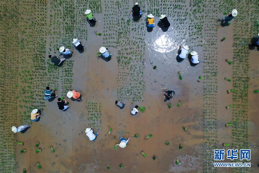6月7日,孩子和家长们在体验稻田插秧(无人机照片)。新华社记者徐昱摄
