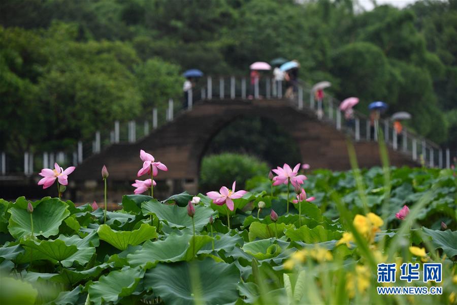 6月7日,一阵小雨过后,福州金山公园内盛开的荷花愈加娇艳欲滴,吸引市民前来游览。新华社记者姜克红摄