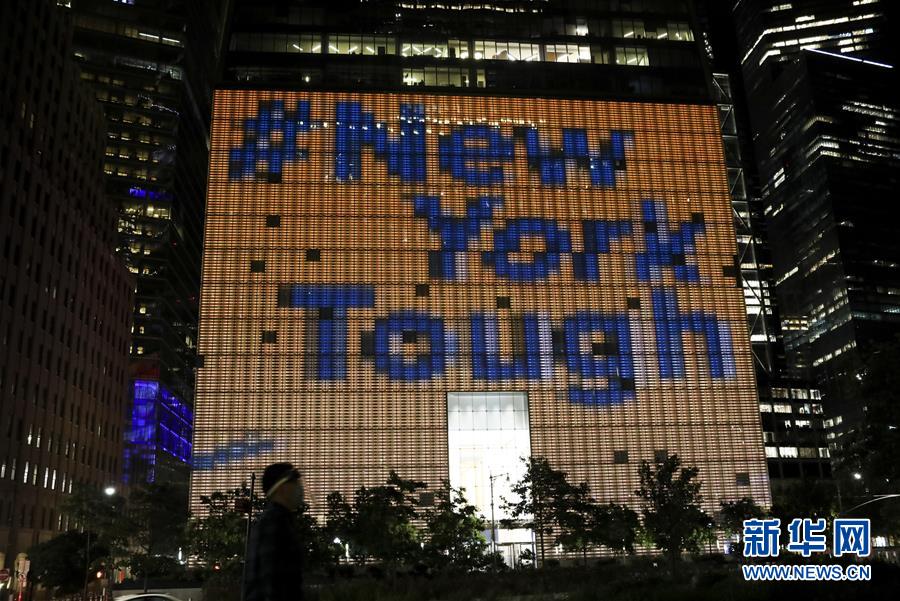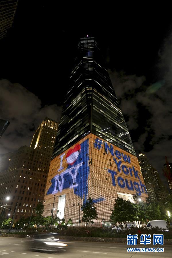 6月7日,美国纽约世贸中心一号楼外墙呈现出“纽约坚强”字样。新华社记者王迎摄