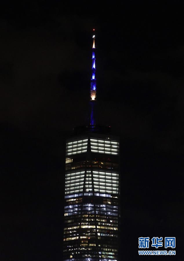 这是6月7日拍摄的点亮蓝色和金色灯光的美国纽约世贸中心一号楼。新华社记者王迎摄