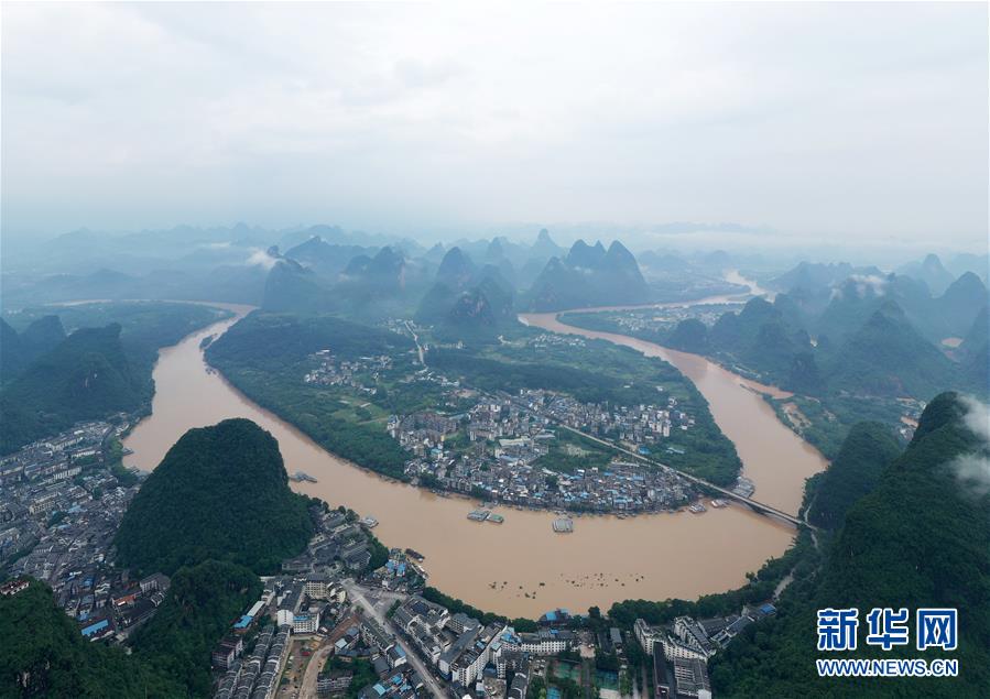 这是洪水奔流的漓江流过广西阳朔县境内(6月8日摄,无人机照片)。6月6日至8日,广西阳朔县普降暴雨,局部降特大暴雨,全县9个乡镇出现洪涝灾害。目前,全县正有序开展灾后生产生活恢复。新华社记者陆波岸摄