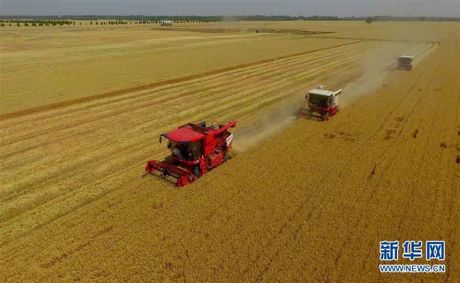 6月8日,联合收割机在河北省南和县闫里乡闫里村麦田进行夏收作业(无人机照片)。“三夏”期间,河北省预计组织和调度小麦联合收割机、拖拉机、夏玉米播种机等200万台农业机械投入作业。新华社记者朱旭东摄