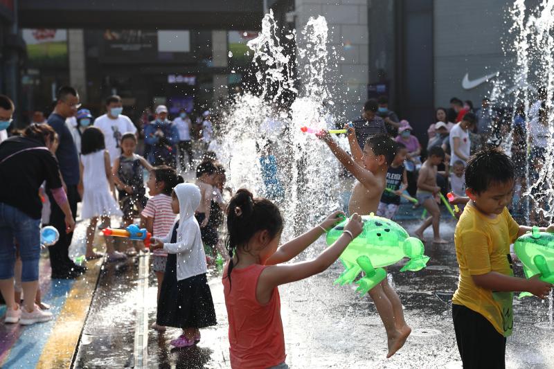 2020年6月7日,北京,华西熙LIVE的喷泉水池成为孩童的戏水降暑天堂。北京6日下午发高温蓝色预警,预计6月7日至8日,北京大部分地区日最高气温达36℃以上。