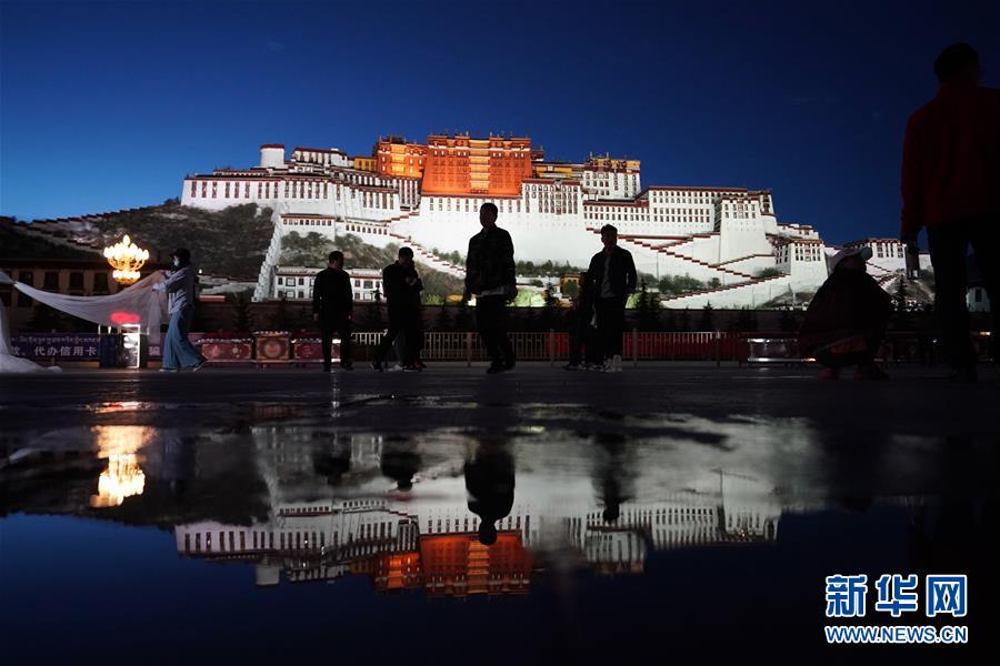 游客在布达拉宫广场游览(6月8日摄)。夜幕降临,西藏拉萨布达拉宫灯光璀璨,夜景迷人。新华社记者詹彦摄