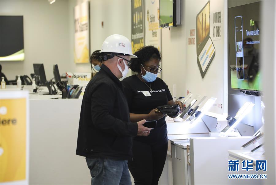 6月8日,店员(右)在美国纽约一家电信运营商营业厅内为顾客服务。在因新冠疫情进入“居家令”近三个月之后,美国纽约市于当地时间8日开始“解封”,进入经济重启的第一阶段。新华社记者王迎摄