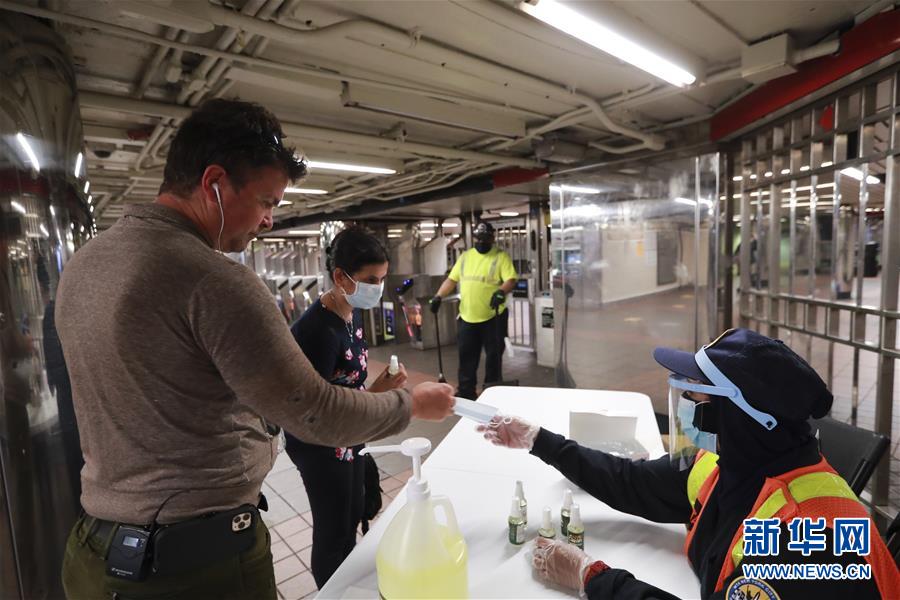 6月8日,在美国纽约,地铁工作人员为乘客发放洗手液和口罩。在因新冠疫情进入“居家令”近三个月之后,美国纽约市于当地时间8日开始“解封”,进入经济重启的第一阶段。新华社记者王迎摄
