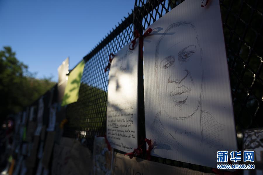 6月8日,美国华盛顿白宫附近的隔离围栏上贴着乔治·弗洛伊德的画像。新华社记者刘杰摄
