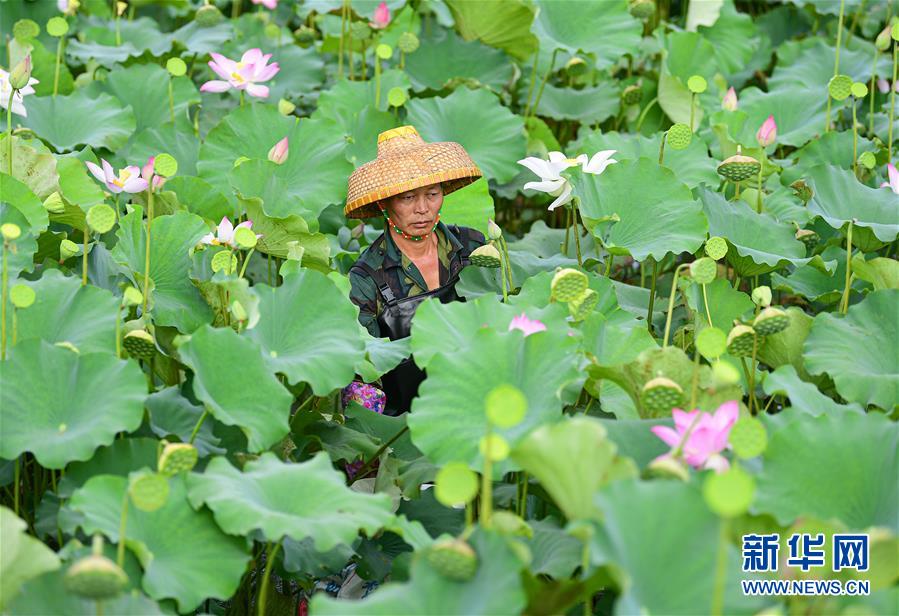 6月9日,村民在海口龙华区龙泉镇美仁坡村采摘莲蓬。初夏时节,位于海南海口龙华区龙泉镇的莲蓬逐渐成熟,当地村民加紧采摘,一派繁忙景象。新华社记者蒲晓旭摄