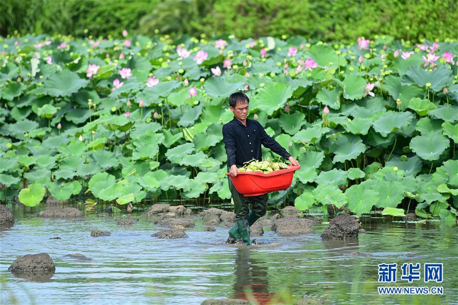6月9日,村民在海口龙华区龙泉镇椰子头村搬运采摘的莲蓬。初夏时节,位于海南海口龙华区龙泉镇的莲蓬逐渐成熟,当地村民加紧采摘,一派繁忙景象。新华社记者蒲晓旭摄
