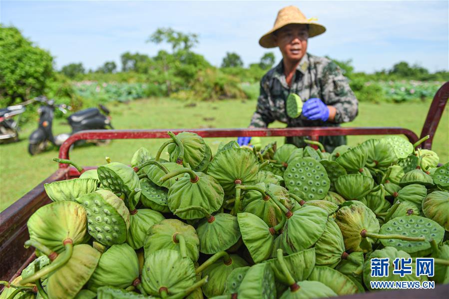 6月9日,村民在海口龙华区龙泉镇椰子头村分拣采摘的莲蓬。初夏时节,位于海南海口龙华区龙泉镇的莲蓬逐渐成熟,当地村民加紧采摘,一派繁忙景象。新华社记者蒲晓旭摄