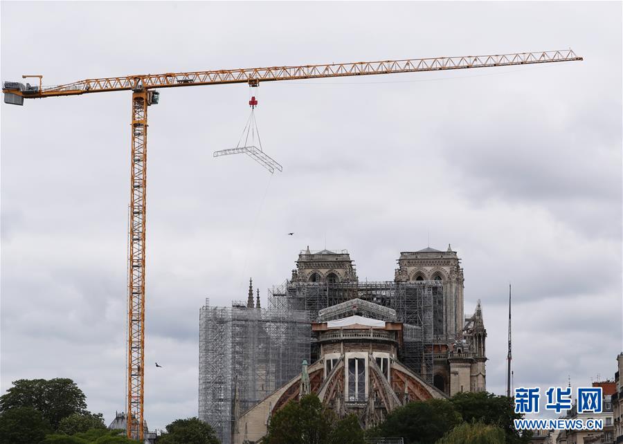 这是6月9日在法国巴黎拍摄的正在进行脚手架拆除工作的巴黎圣母院。法国巴黎圣母院于8日开始拆除去年大火中被焚的脚手架。作为巴黎圣母院修复工作的重要组成部分,这项工程预计将持续至少3个月。2019年4月15日,巴黎圣母院遭遇大火,当时圣母院正在进行维修,搭建的脚手架在火灾中损毁、变形。新华社记者高静摄