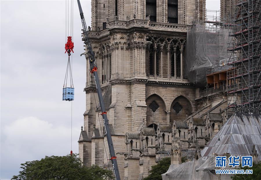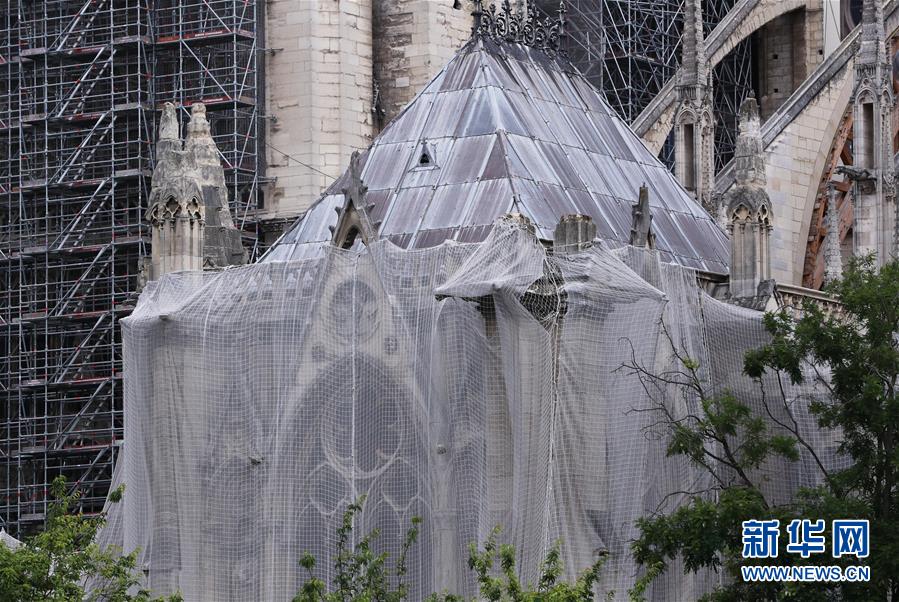 这是6月9日在法国巴黎拍摄的正在进行脚手架拆除工作的巴黎圣母院。法国巴黎圣母院于8日开始拆除去年大火中被焚的脚手架。作为巴黎圣母院修复工作的重要组成部分,这项工程预计将持续至少3个月。2019年4月15日,巴黎圣母院遭遇大火,当时圣母院正在进行维修,搭建的脚手架在火灾中损毁、变形。新华社记者高静摄