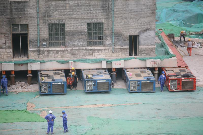 2020年6月9日,济南在历山路与东关大街交叉口,液压模块拖车在修女楼底部做好平移准备。