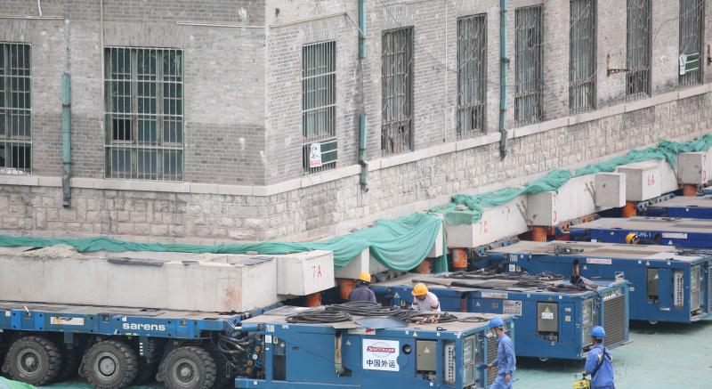 2020年6月9日,济南在历山路与东关大街交叉口,液压模块拖车在修女楼底部做好平移准备。