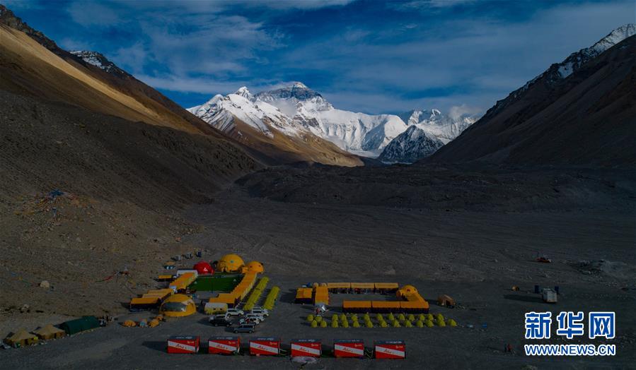 这是海拔5200米的珠峰登山大本营(无人机照片,5月25日摄)。从空中俯瞰珠穆朗玛峰北坡,生机勃勃的高原湿地、蜿蜒曲折的盘山公路、壮丽秀美的绒布冰川,还有安静的村庄和热闹的登山营地,共同构成一幅壮美画卷。新华社记者普布扎西摄