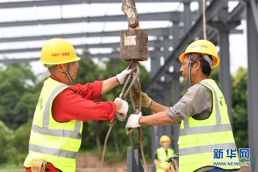 6月9日,工人在位于重庆市巴南区的渝湘高铁重庆段建设工地现场作业。新华社记者唐奕摄