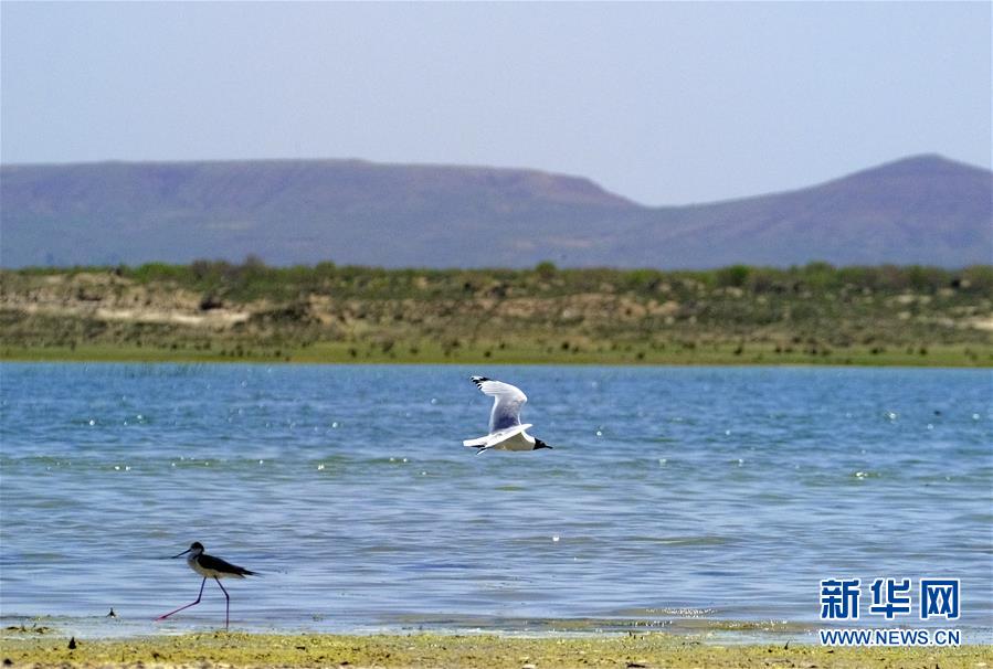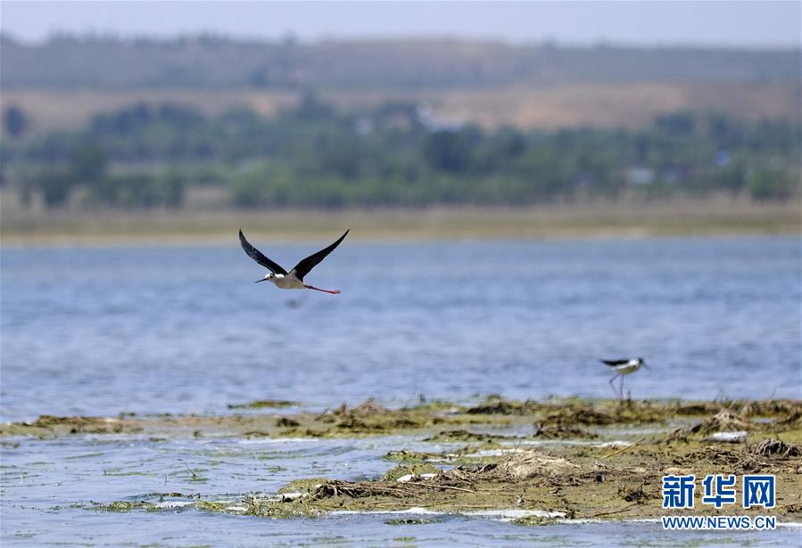 这是6月9日在泊江海子拍摄的黑翅长脚鹬。近年来,在当地政府的多种措施治理下,曾经水面萎缩的内蒙古自治区鄂尔多斯市境内的泊江海子水量逐渐恢复。近期,包括遗鸥在内的40多种鸟类来此栖息,泊江海子重新成为鸟类的乐园。新华社记者贾立君摄
