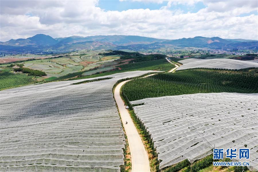 这是6月11日拍摄的贵州省威宁县一处苹果基地(无人机照片)。近日,贵州省威宁彝族回族苗族自治县的农民抢抓农时,对苹果园进行疏果、除草等田间管理,呈现出一派夏管农忙景象。威宁县苹果种植面积50余万亩,苹果产业已逐步成为当地农民增收致富的主导产业之一。新华社记者杨文斌摄。