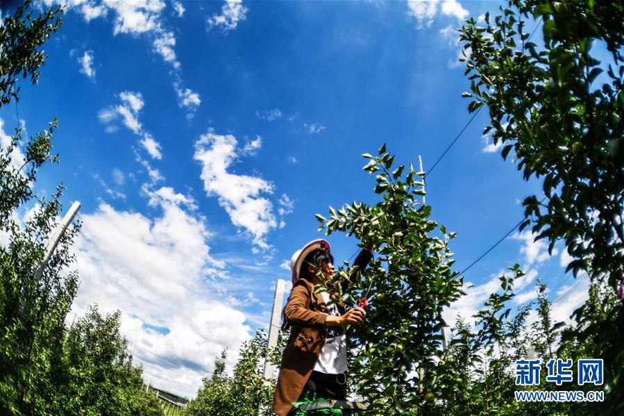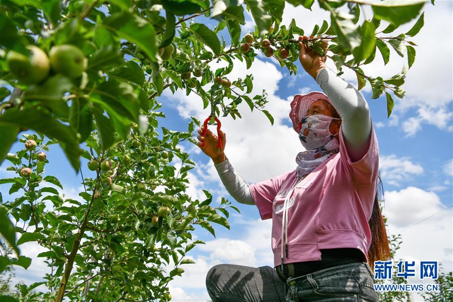 6月11日,农民在贵州省威宁县一处苹果基地里疏果。近日,贵州省威宁彝族回族苗族自治县的农民抢抓农时,对苹果园进行疏果、除草等田间管理,呈现出一派夏管农忙景象。威宁县苹果种植面积50余万亩,苹果产业已逐步成为当地农民增收致富的主导产业之一。新华社记者杨文斌摄。