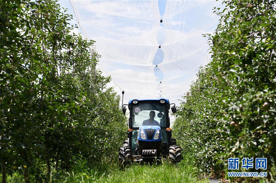 6月11日,农民在贵州省威宁县一处苹果基地里驾驶农机管护果园。近日,贵州省威宁彝族回族苗族自治县的农民抢抓农时,对苹果园进行疏果、除草等田间管理,呈现出一派夏管农忙景象。威宁县苹果种植面积50余万亩,苹果产业已逐步成为当地农民增收致富的主导产业之一。新华社记者杨文斌摄。