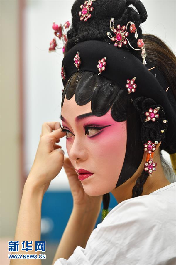 6月12日,广东粤剧院演员在演出前化妆。当日,广东粤剧院联合酷狗网络直播平台推出“周末睇大戏(线上版)”,将线下剧场转移到线上,在酷狗直播间里呈现粤剧的经典剧目,为剧迷们打造一场“云端”盛宴。新华社记者 刘大伟 摄